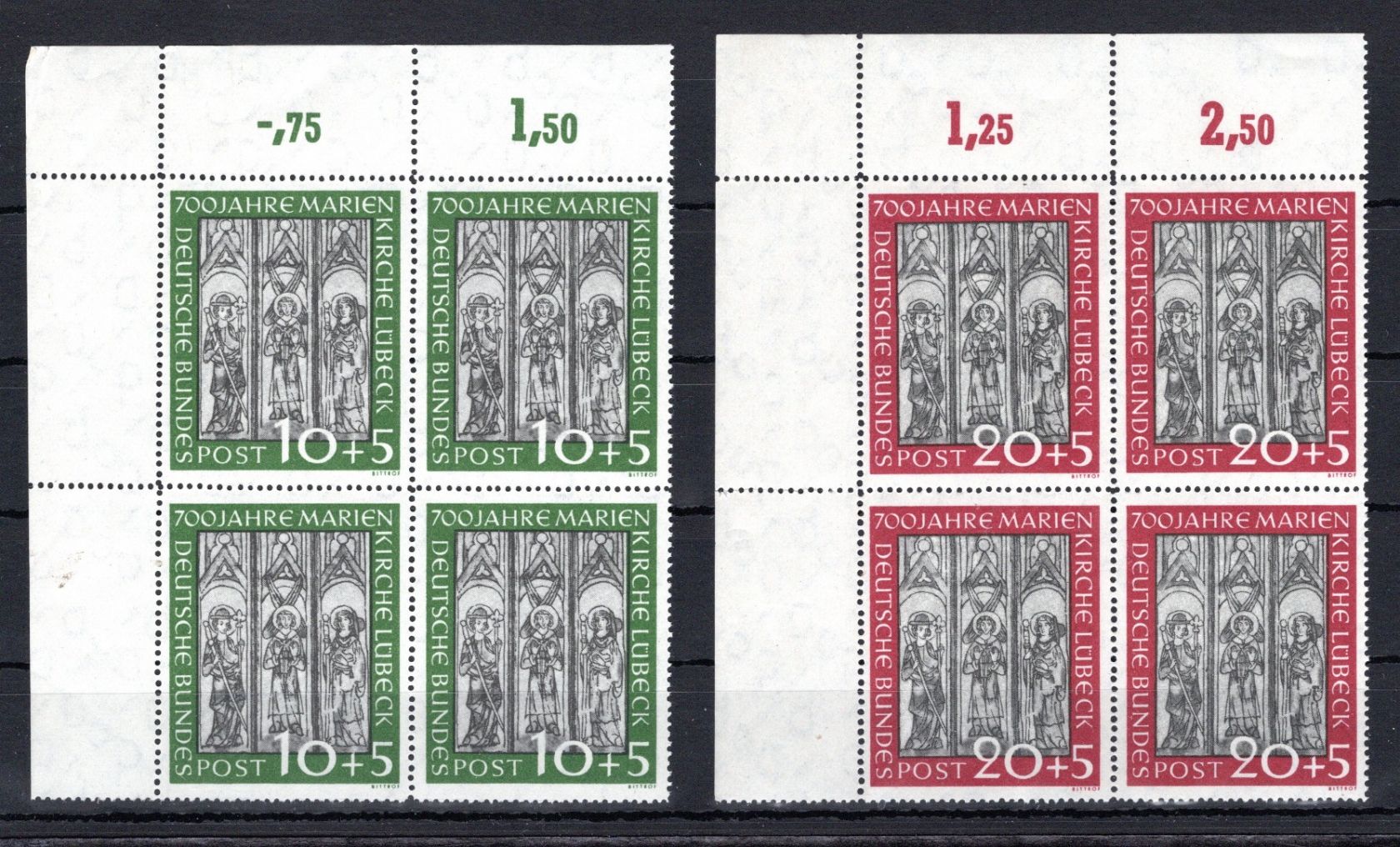 Bei MiNr. 140 ist der Bogenrand der unteren Reihe angetrennt.