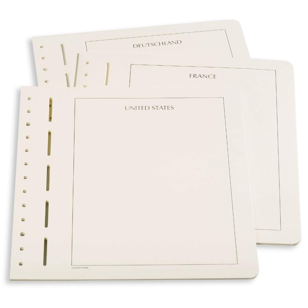 Zur weiteren Ergänzung der Vordruckalben sowie zum Aufbau individueller Sammlungen gibt es für gängige Sammelgebiete Albenblätter mit Landesbezeichnung. Das Blattformat ist einheitlich 270 x 297 mm und passend für alle LEUCHTTURM-Albenbinder.