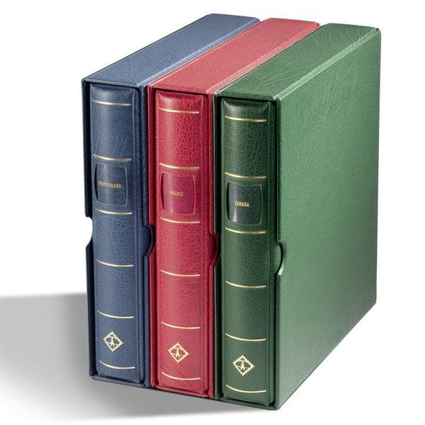 Im Lieferumfang enthalten sind 45 Kartoneinlagen mit goldfarbenen Länderbezeichnungen (für die beliebtesten Sammelgebiete) sowie 5 Blanko-Kartoneinlagen zur individuellen Beschriftung. Nachträgliche Änderungen der Beschriftung sind durch ein einfaches Austauschen der Kartoneinlagen möglich. Schutz erhält die Kartoneinlage durch einen zusätzlichen Einschub aus Klarsichtfolie. Inkl. passender Schutzkassette.