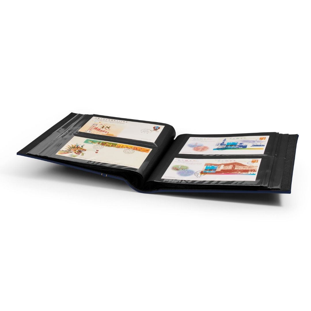 Für 200 Ersttagsbriefe (First-Day-Cover), Postkarten und Ganzsachen. Mit 50 doppelseitigen, klarsichtigen, weichmacherfreien Hüllen und eingearbeiteten schwarzem Trennfolien, mit dem Rücken verbunden.