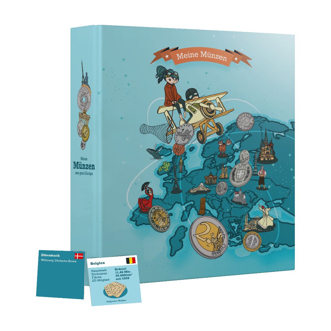 Ganz gleich ob Euro, Krone oder Denar – in dieses Starter-Album passt jede aktuelle europäische Währung. Zusätzlich entdeckt man auf den liebevoll illustrierten Landeskärtchen interessante Fakten und Zahlen zu jedem europäischen Land.
