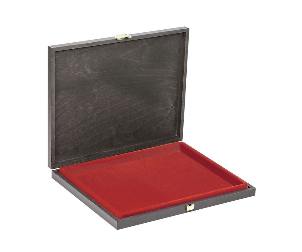 Echtholz-Sammelkassette mit einer helllroten Einlage ohne Facheinteilung, Innenformat 210 x 270 mm / Max. Füllhöhe 18,5 mm.