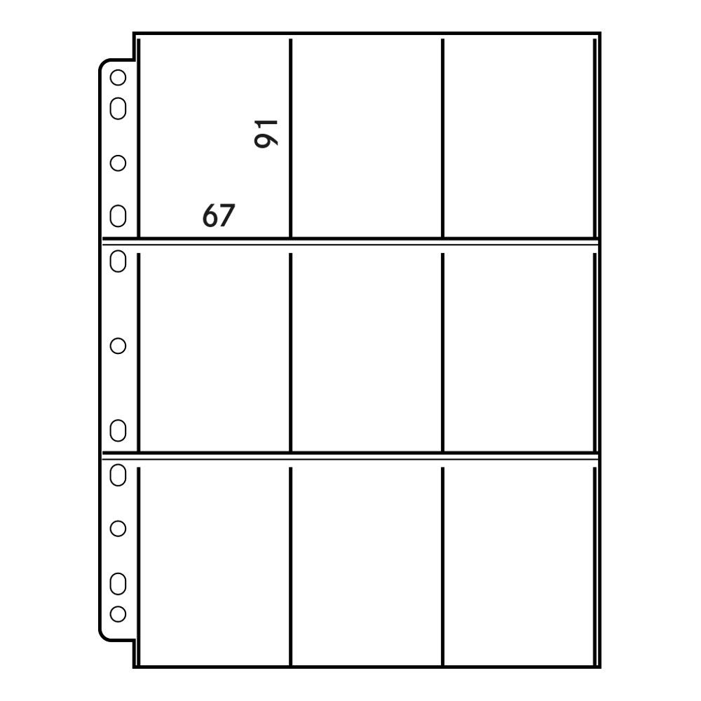 Glasklare Kunststoff-Einsteckblätter für jew. 9 Sammelkarten im Format 2,5 x 3,5 Inches (max. 65 x 90 mm). Bei doppelter Bestückung bietet jedes Einsteckblatt Platz für 18 Sammelkarten.