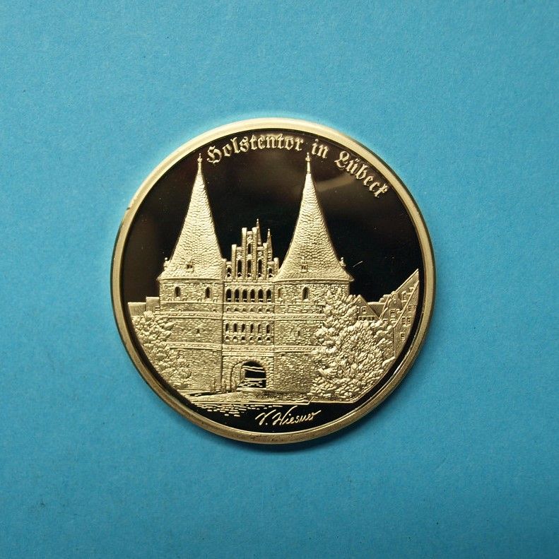 Die Medaille ist gekapselt. Durchmesser 50 mm Gewicht ca. 54 Gramm Kupfer vergoldet