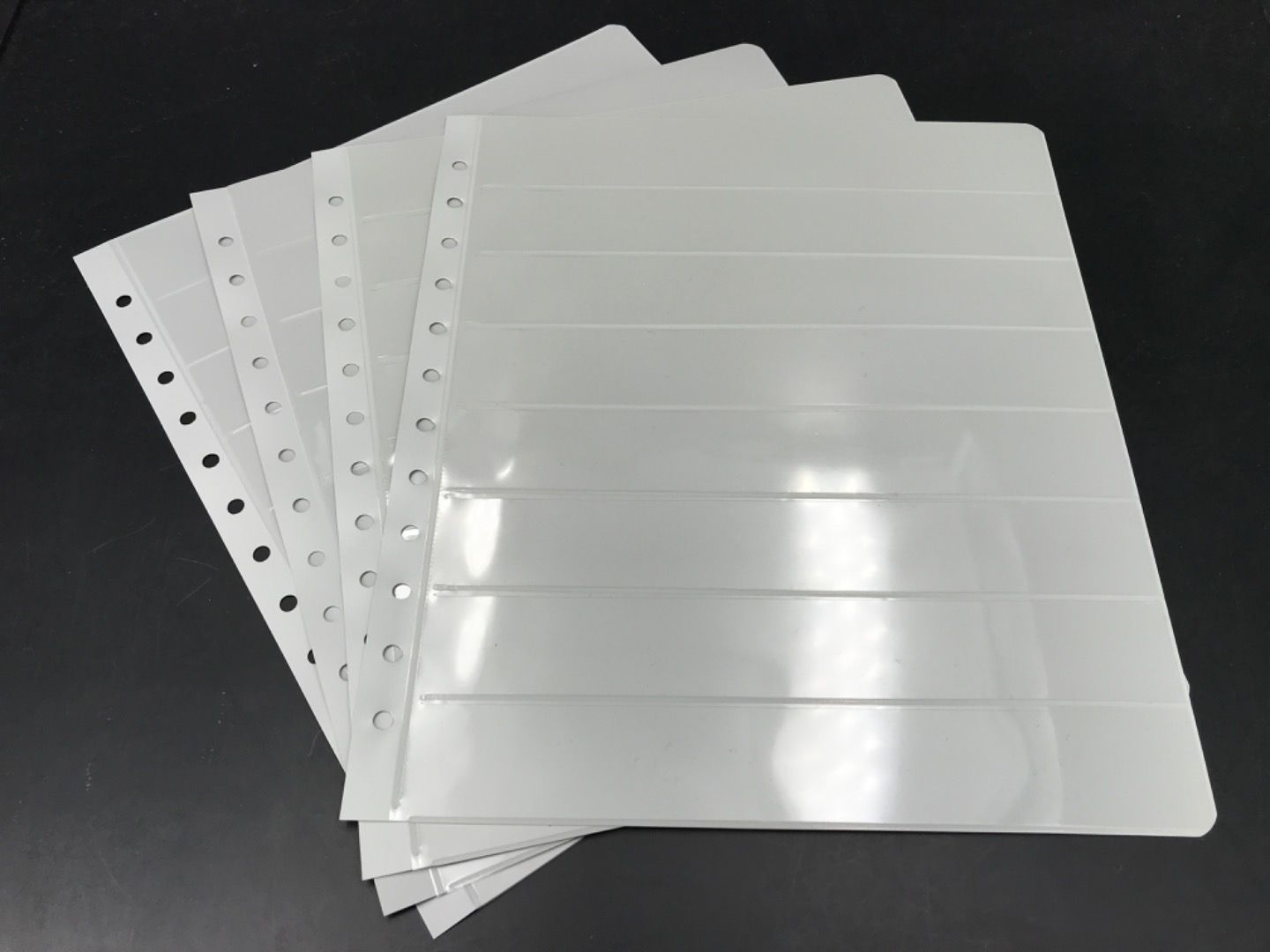 Einsteck-Blatt aus Plastik, (vertikal) unterteilt in 8 je 3,5 cm hohe Klarsicht-Taschenstreifen, in die sich Briefmarken flexibel einordnen lassen, wobei sie aber auch im Ringbuch-Album befestigt und gut geschützt sind
