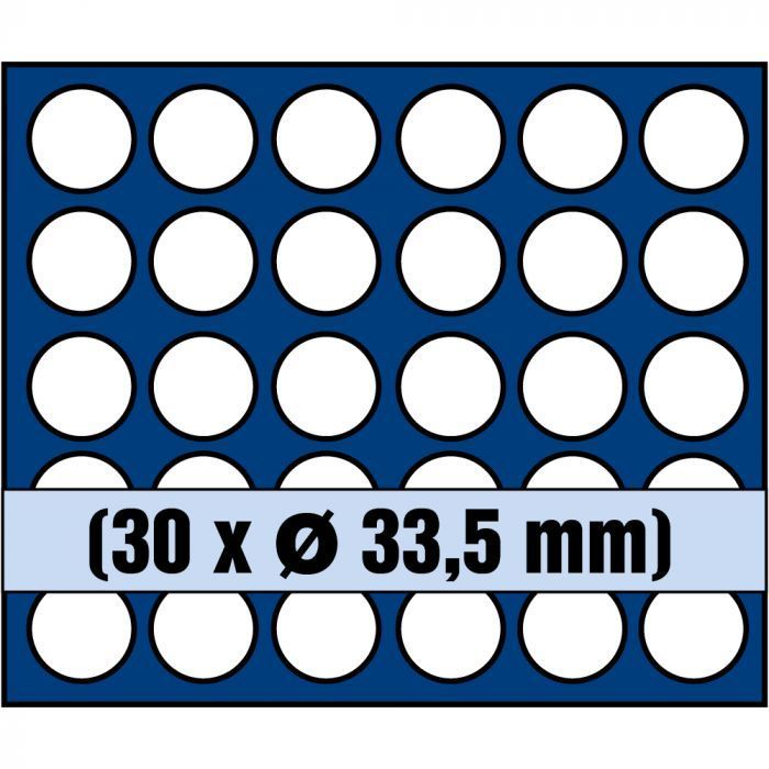 Die Münzeinsätze sind königsblau beflockt und mit runden und eckigen Fächern erhältlich. Auch für Münzen in Kapseln geeignet (die mm-Angaben sind die maximalen Fachgrößen für die Münze bzw. für die Kapsel).