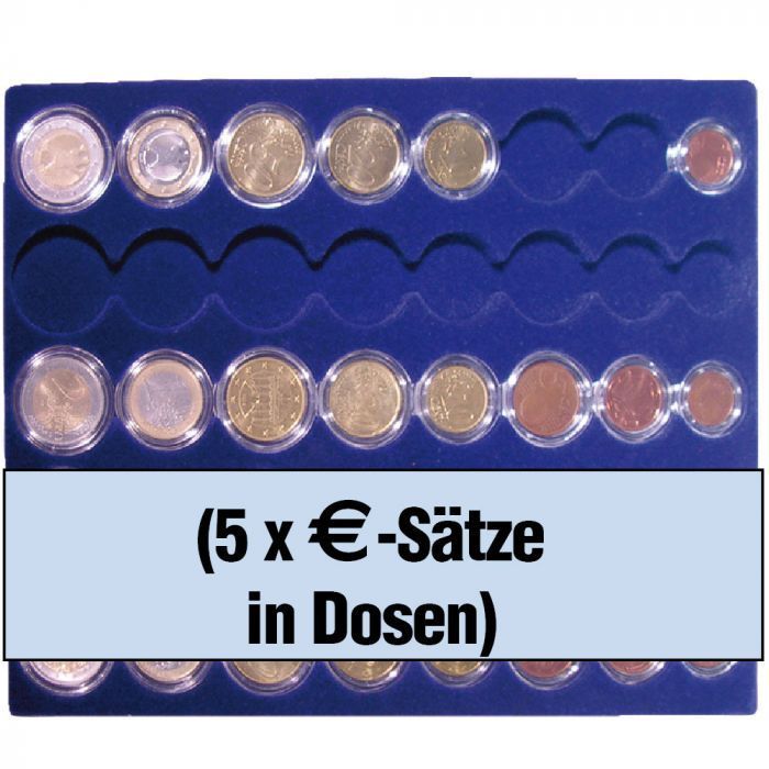 Die Münzeinsätze sind königsblau beflockt und mit runden und eckigen Fächern erhältlich. Auch für Münzen in Kapseln geeignet (die mm-Angaben sind die maximalen Fachgrößen für die Münze bzw. für die Kapsel).