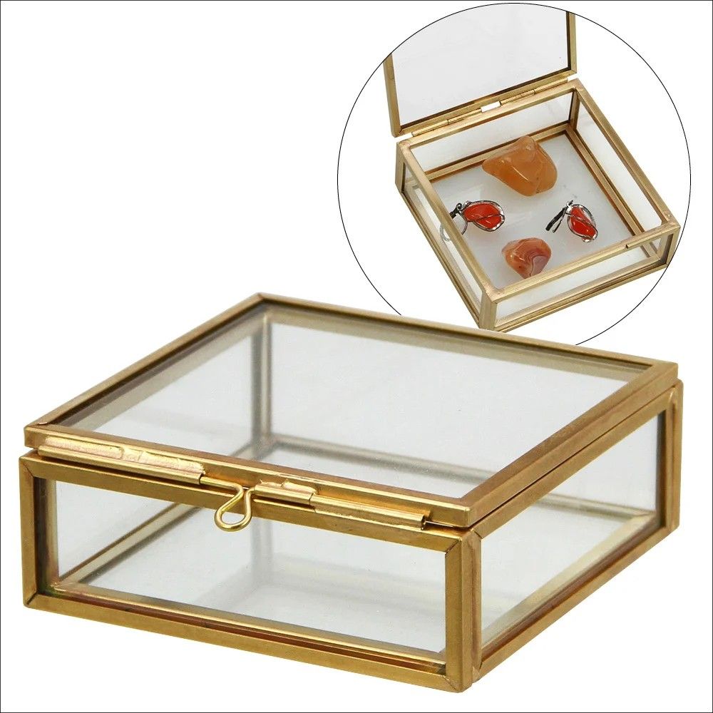 Die Glasflächen sind nach alter Handwerks-Kunst in filigrane Messing-Leisten eingelassen. Ideal zur Aufbewahrung von Schmuck, Mineralien und anderen schönen Erinnerungs- und Sammel-Stücken. Alle Wandungen, wie auch Boden und Deckel der Vitrine sind aus Echtglas. Der Deckel kann mit einem Splint geschlossen werden.