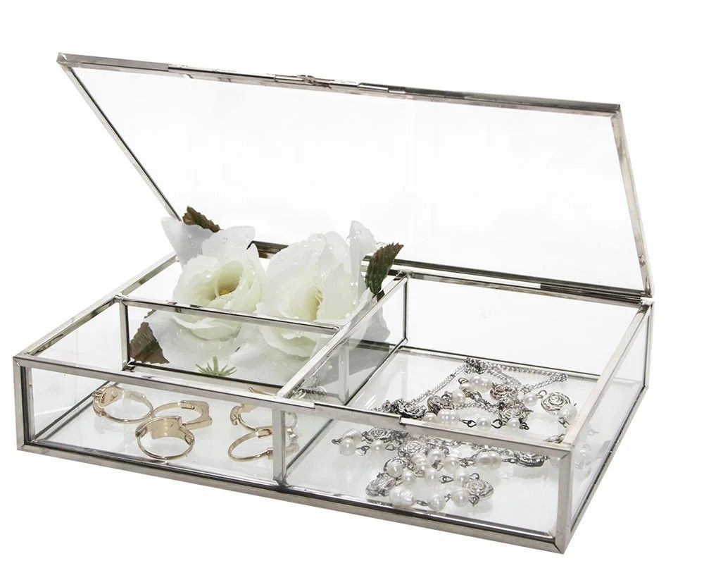 Ideal zur Aufbewahrung von Schmuck, Mineralien und anderen schönen Erinnerungs- und Sammel-Stücken. Alle Wandungen, wie auch Boden und Deckel der Vitrine sind aus Echtglas. Der Deckel kann mit einem Splint geschlossen werden.