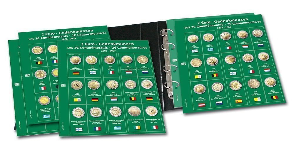Geprägte Hochglanz-Metallplaketten auf Cover und Rücken. Stabile 4-Ring-Mechanik. Mit 8 Folienblättern und Einschub-Streifen für die Münzen. Mit 8 farbigen Vordruckblättern der 2€-Gedenkmünzen der Jahre 2024-2025. Erweiterbar.
