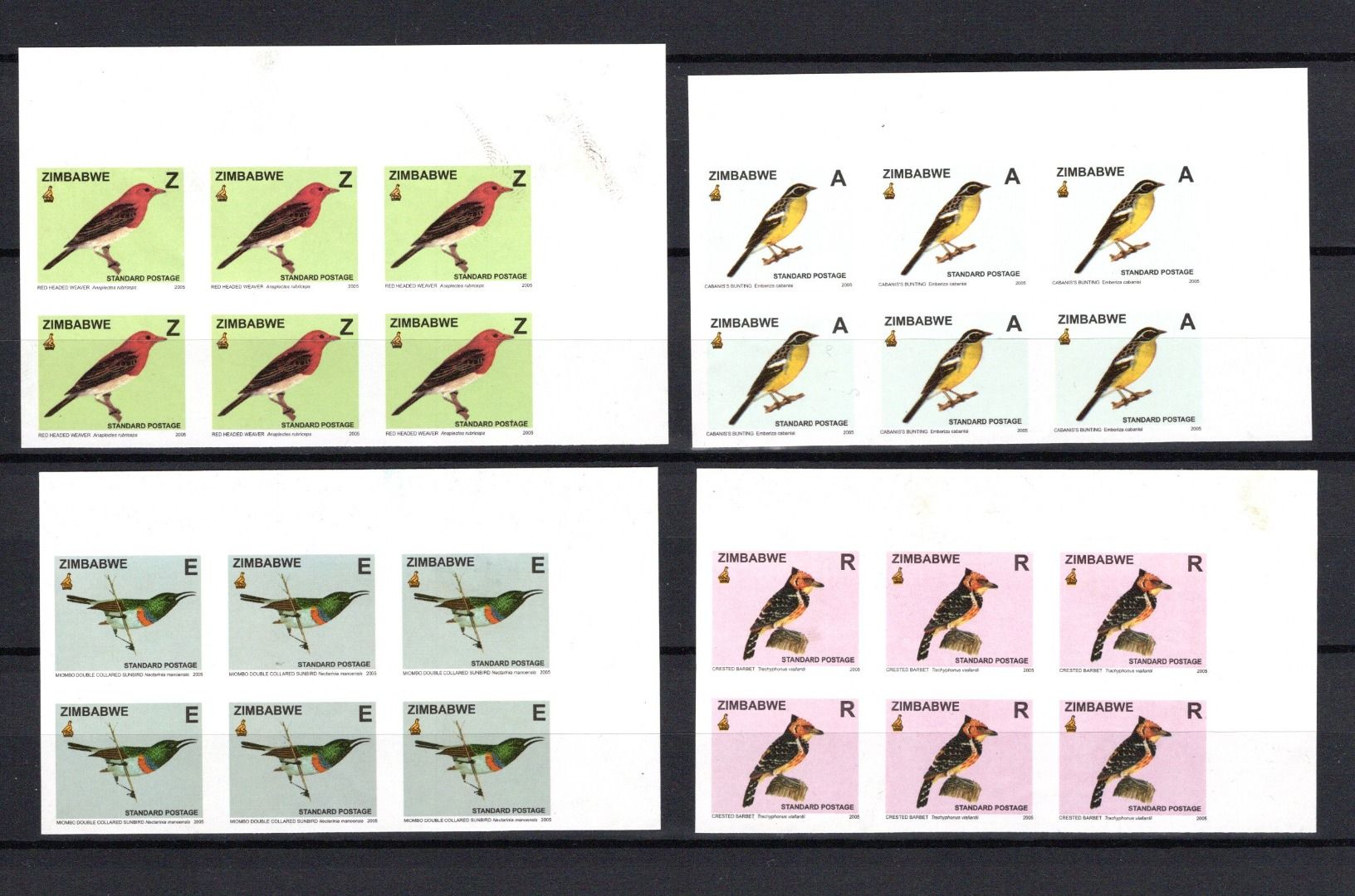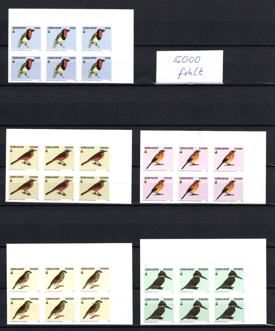 Vögel von Simbabwe 2005: fast vollständiger Satz ungezähnte Eckrand-6er-Blöcke oben rechts, nur der 5000er Wert fehlend. Gleichmäßige Ränder oben rechts, insgesamt in sehr gutem Zustand, alle postfrisch, nicht angeklebt. Werte Z und R oben rechts mit Verschmierungen laut Abbildung!