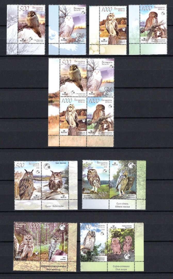 Weißrussland MiNr. 672ff + 750ff Eulen Uhus Satz und ZD postfrisch Tiere